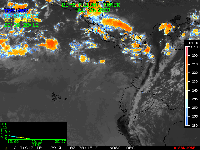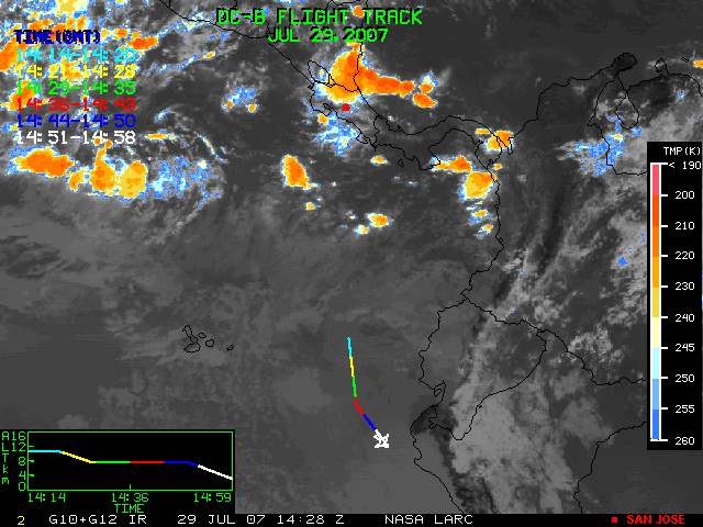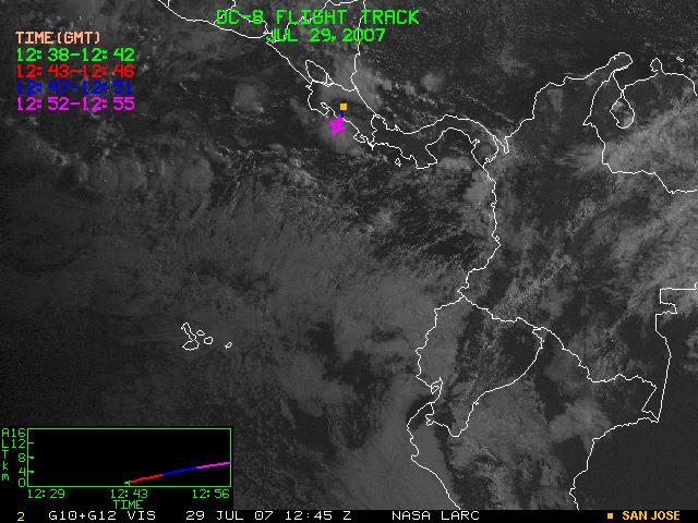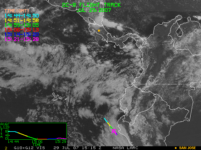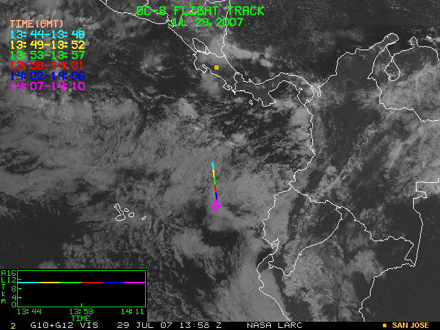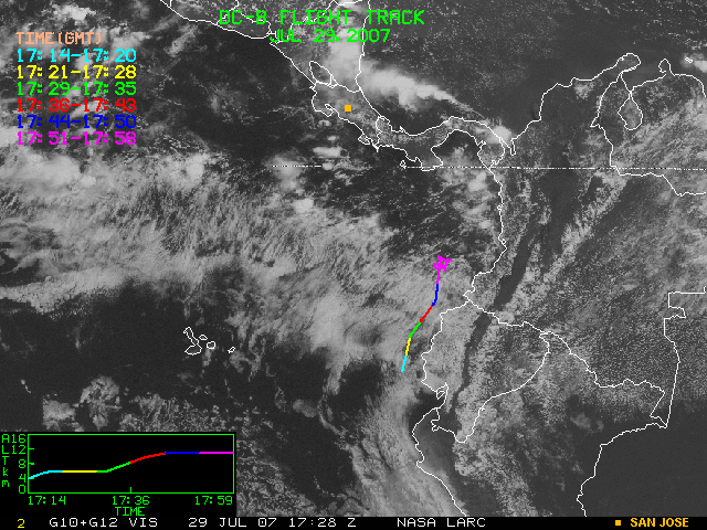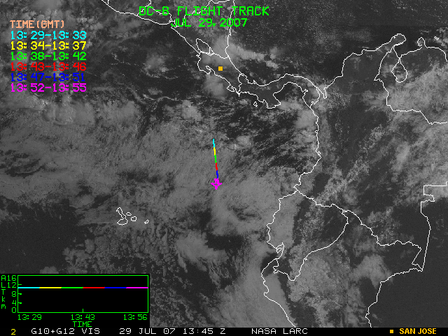 GOES (G10+G12) Visible image (29 July 2007 16:28 UTC) showing DC8 flight track